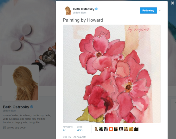 Stern è veramente un cretino di tutti i mestieri. Secondo Artnet, sa come muoversi sulla tela. Sua moglie Ostrosky ha commissionato al marito una serie di dipinti; questa foto è uno di essi. Lei ha rivelato che lui ha dipinto una rosa, un lilla e una peonia. Non siamo troppo sicuri se vende i suoi pezzi. Tuttavia, secondo sua moglie, sono su richiesta e la gente vuole comprarli.