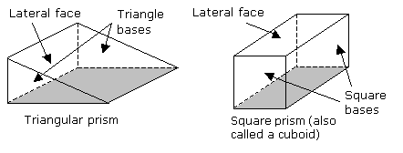 Un prisma è un solido che ha due facce parallele che sono poligoni congruenti alle due estremità. Queste facce formano le basi del prisma. Le altre facce sono a forma di rettangolo. Sono chiamate facce laterali. Un prisma prende il nome dalla forma della sua base.