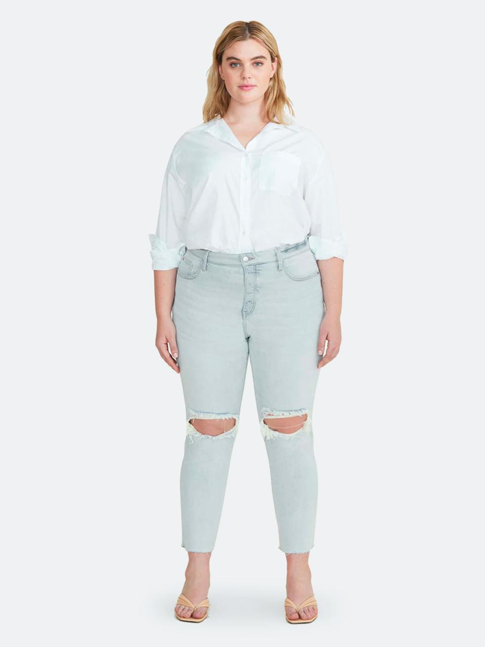 Wykonane, aby przytulić i podkreślić Twój tyłek bez przerażającej luki w talii, Proste jeansy Curvy Cheeky marki Everlane mają bardzo wysoki stan, klasyczną prostą nogawkę, podwyższony tylny szew i są dostępne w rozmiarach od 23 do 35. Zaprojektowane z myślą o sylwetce klepsydry, zostały wykonane z nowym stosunkiem obwodu bioder do talii, dzięki czemu idealnie dopasowują się do kształtu bioder i ud. Co więcej, kieszenie w tej parze zostały umieszczone wyżej i bliżej siebie, aby nadać jej bardziej podniosły wygląd.